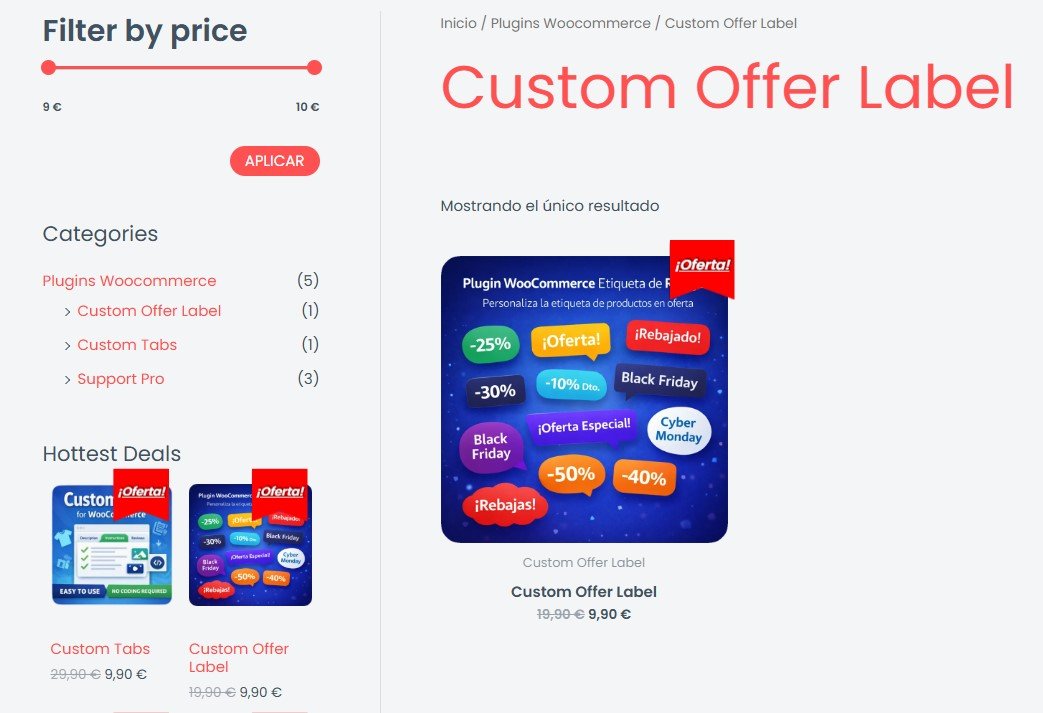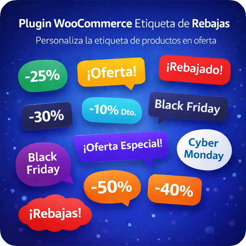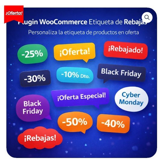 Este plugin te permite personalizar por completo la etiqueta de “Rebajado” que WooCommerce muestra automáticamente cuando un producto está en oferta, sin tocar código y con resultados visuales profesionales.